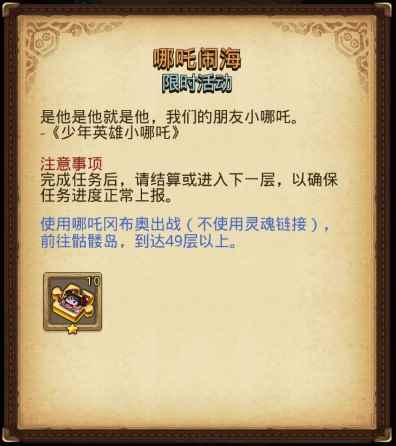 召唤出我们的小英雄,前往骷髅岛,上演一波哪吒闹海。与暴躁小老弟一起闯过49层,就可得冈布奥碎片奖励。