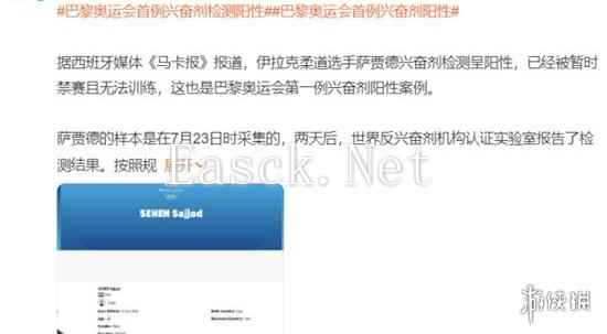 据报道,西班牙《马卡报》披露,伊拉克柔道选手萨贾德在兴奋剂检测中结果呈阳性,因此已被暂时禁赛并禁止训练,这也是巴黎奥运会首例兴奋剂阳性事件。