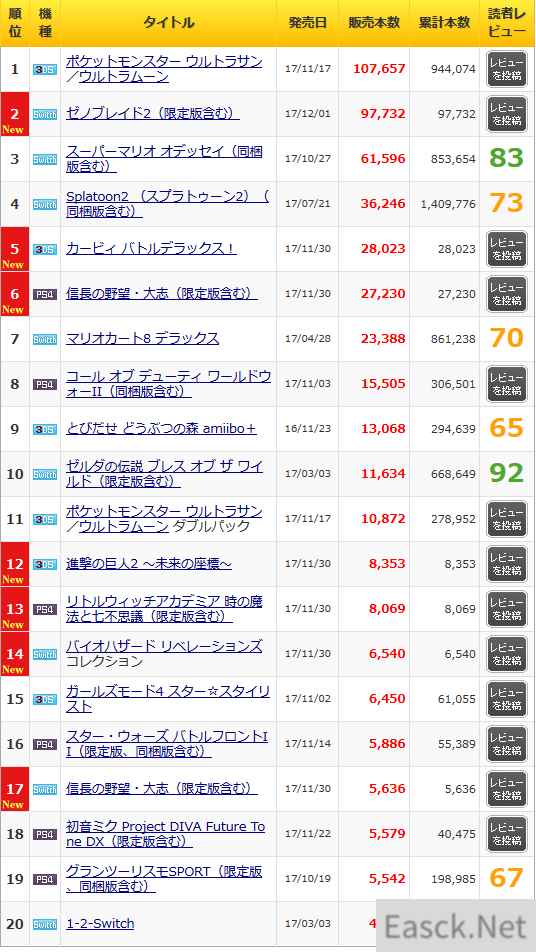 2017年11月27日~12月3日的日本游戏/硬件周销量榜现已公布,《精灵宝可梦:究极之日/月》卖出10.8万份,保持第一;Switch新作《异度之刃2》销量9.8万份,夺得销量榜第二,与前两作相比,本作首发销量达到系列最高,并且取得了不错的口碑。