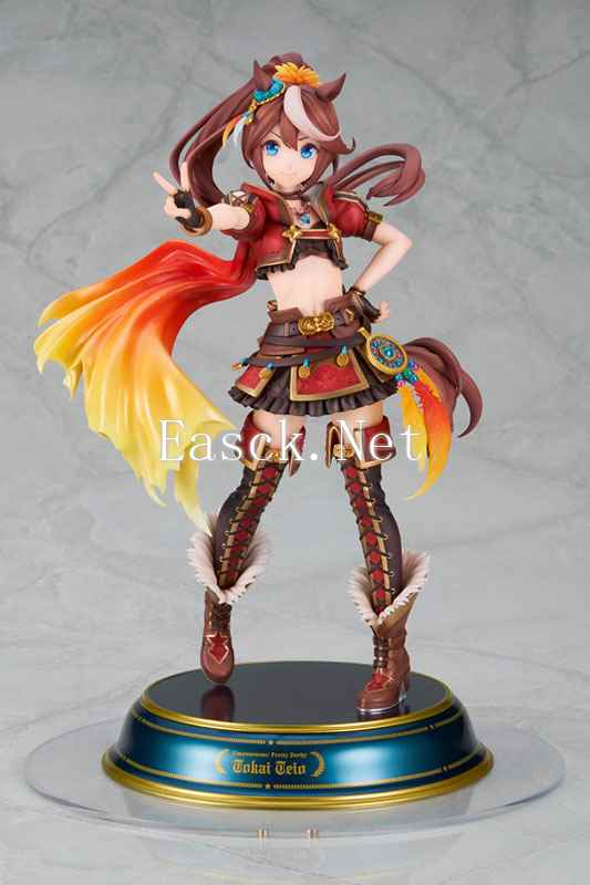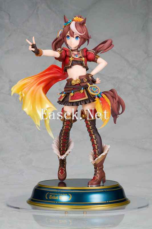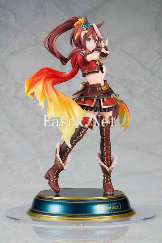 甩起自己长马尾的东海帝王头上依旧是那标志性的一抹白色挑染。马耳上挂着羽毛装饰,脖子与腰带上的装饰等细节也都没有落下。左手单手掐腰,右手摆出胜利的V字收拾,少女脸上也展露着自信的笑容。短短的夹克展露出白皙的小腹,肚脐与小腹轮廓也进行了阴影刻画。以红色为基调的特色着装上火焰一般的披风上点缀着彩粉搭配上金属漆涂装十分华丽。