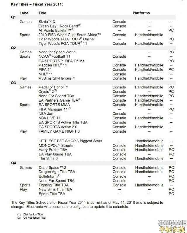 EA宣布2010财年第四季(即今年首季)有五款作品售出至少400万份,即:《FIFIA 10》、、《麦登NFL 10》《模拟人生3》、《战地:叛逆连队2》、《极品飞车:Shift》,其中《战地:叛逆连队2》累计销量突破500万份。 · 模拟人生系列全球累计销量突破1.25亿,《模拟人生3》销量过400万份FIFA 10自发布以来全球销量突破1000万份 · 《战地1943》下载量(PSN、XBLA合计)超过150万份 · 《战地:叛逆连队2》自发布以来已售出500万份,其中,上市当月即售出200万份 · 《2010 FIFA南非世界杯》的销量已逼近200万份 · 《Army of Two:第40天》首发当季售出超过100万份 · 《Mass Effect 2》首发当季售出超过160万份 · 《但丁地狱》销量累计接近100万份 EA同时公布了2010财年公司业绩: GAAP准则下全年净亏6.77亿(计入公司重组开销1.40亿)美元,较去年10.88亿的巨亏有所改善;非GAAP口径则录得净利润1.45亿,去年非GAAP业绩则为净亏9600万美元。 具体到2010财年第四季,形势更是一片大好: GAAP准则下录得当季净利润3000万美元,去年同期则是净亏4200万美元;摊薄后每股收益9美分,去年同期则每股净亏1毛3。 EA首席执行官John Riccitiello认为《战地:叛逆连队2》的市场表现功不可没: “公司第四季硕果累累,《叛逆连队2》的市场表现超出预期,据我们所知该作在利润贡献榜上位居首列,超乎我们想象。” EA今天释出的一份新的财报