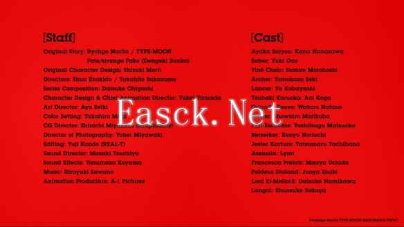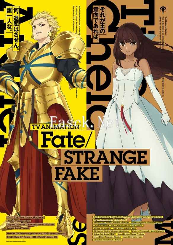 原作:成田良悟・TYPE-MOON 『Fate/strange Fake』(電撃文庫刊) 角色原案:森井しづき 导演:榎戸骏・坂诘嵩仁 系列构成:大东大介 角色设计·总作画监督:山田有庆 美术监督:清木亜夕 色彩设计:茂木孝浩 CG监督:宫风 慎一(グラフィニカ) 摄影监督:宫脇洋平 剪辑:近藤勇二(REAL-T) 音响监督:土屋雅纪 音响効果:小山恭正 音乐:泽野弘之 制作:A-1 Pictures