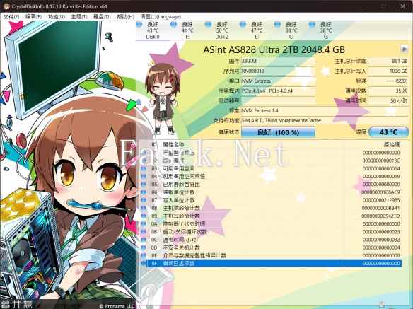 插上电脑,打开CrystalDiskInfo。系统成功识别出这块ASint AS828 Ultra 2TB固态硬盘。可以看到,它采用了PCIe G4x4的总线,支持NVMe 1.4标准。