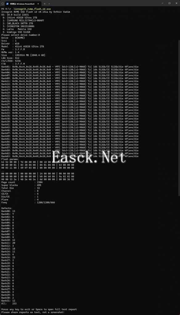 使用FlashID查询,可以看到这款固态硬盘采用了四颗来自长江存储的512GB 128L TLC颗粒 X2-9060。作为长存第三代3D NAND颗粒,X2-9060基于Xtacking 2.0技术打造,兼容ONFI 4.2标准,最高IO速度可达1.6GT/s,性能表现相当出色,也广泛被用于各种固态硬盘产品中。