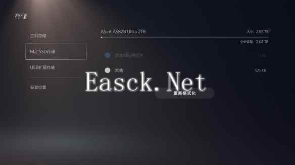 在完成初始化后,PS5能够正常识别我们这张固态硬盘的型号,容量也有足额的2TB。与本机自带的小得可怜的固态硬盘相比,安装ASint AS828 Ultra 2TB绝对能够带来十分显著的提升。