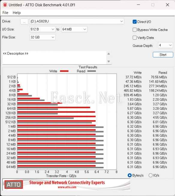 来到更底层的测试项目,我们使用ATTO测试这块固态在4深度不同文件块下的性能表现。可以看到,这块硬盘的优化偏向小文件读取与大文件写入,这点是符合日常使用的需求的。