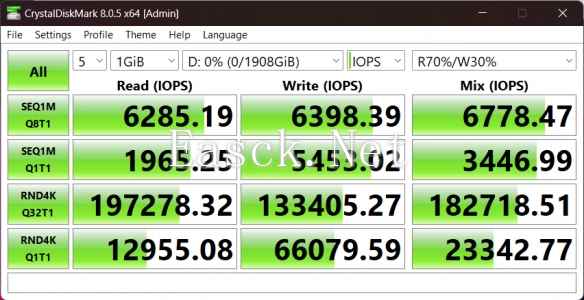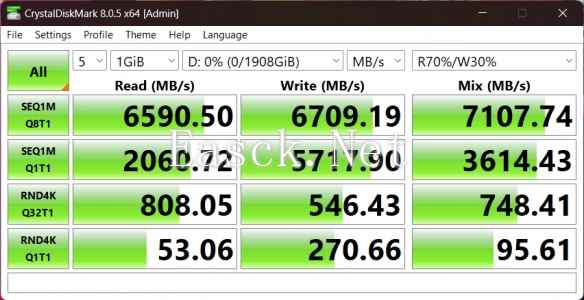 在CystalDiskMark中使用5次1GB的配置进行读70%写30%的性能测试,性能如图。可以看到,在常见的多线程读写测试中,这张盘的性能表现十分出色。尽管在单线程操作中单读表现显著弱于单写,但是这种场景在实际使用中也很难出现。而在更贴合实际应用环境的混合读写测试中,这张盘的性能表现也相当出彩,轻松应对用户的使用需求。