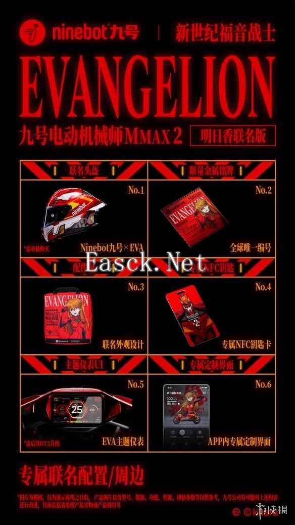 除了联名车型,九号还为这次的联名企划推出了一系列联名周边,包括九号电动EVA联名全盔(需单独购买),这是一款专业级运动全盔,设计上以EVA初号机为灵感,高度还原了初号机的经典元素,同时拥有多重防护,颜值和安全感并存!此外还有全球唯一编号金属铭牌、联名设计配件包、定制NFC卡片钥匙、九号出行App内专属动态界面、主题仪表UI等,给足EVA粉满满的沉浸感!