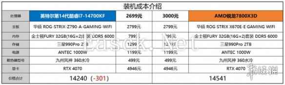 装机成本上,两款处理器的整机装机平台成本如上图所示,因为机箱因人而异,所以上面不做推荐,玩家可以自行选择。成本上面,两套配置上的差价在300元左右,但是i7-14700KF的网络游戏性能并不落后太多,3A和RTS类游戏领先明显,并且在内容创作性能方面,要大幅领先。