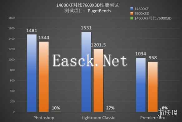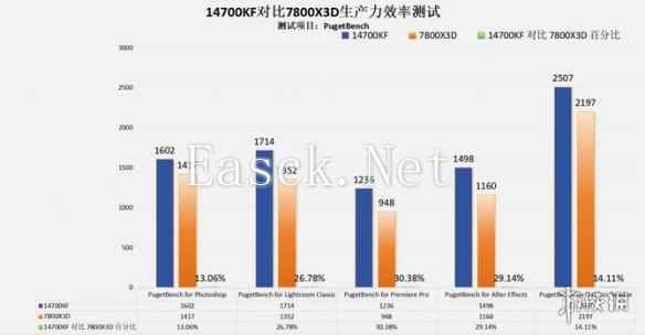 PugetBench测试中可以看到,两款处理器的性能对比依旧有着明显的差距,在PS、LR和PR这三款测试结果上,英特尔酷睿i5-14600KF分别领先AMD锐龙7600X3D为10%、27%和8%,平均领先幅度达到了15%,在后期内容创作方面,英特尔依然有着非常明显的性能优势。