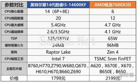 接下来我们再来看一下,英特尔酷睿i5-14600KF和AMD锐龙7600X3D的对比测试,首先先来看一下处理器参数对比和测试平台。