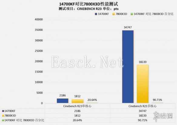 基准性能测试上,我们先来看看CINEBENCH R23测试中,i7-14700KF的单核心性能领先7800X3D为20.64%,而多核心则领先90.71%,领先幅度非常大。