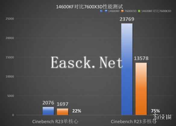 基准性能测试的CINEBENCH R23测试中,英特尔酷睿i5-14600KF的单核心成绩和多核心成绩分别为2076和23769,领先锐龙7600X3D分别为22%和75%,尤其是多核心性能表现上,近乎有了翻倍的表现,非常夸张。