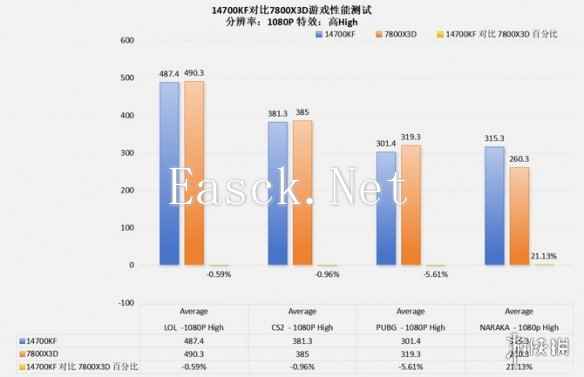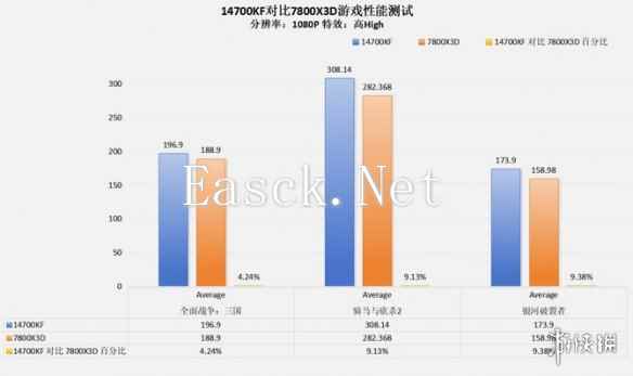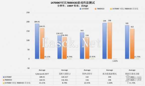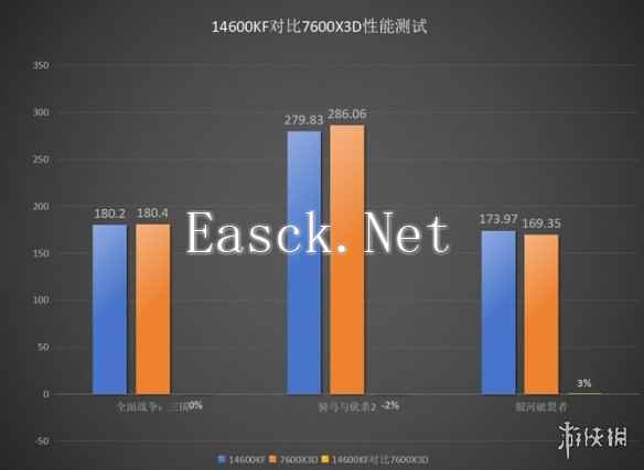 所以从单纯的测试结果上来看,7800X3D的游戏偏科较为明显,针对网游的性能表现明显更好,而酷睿i7-14700KF的游戏性能表现较为全面和稳定。