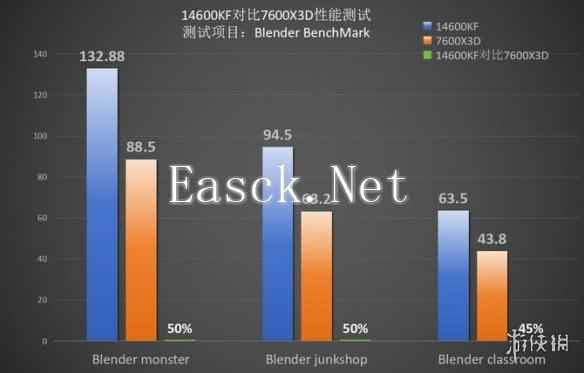 Blender的渲染测试中,三个渲染项目上,英特尔酷睿i5-14600KF的领先幅度基本在50%左右,效率明显更高,在后期渲染的过程中,能够让用户减少不必要的等待时间,提升工作效率。