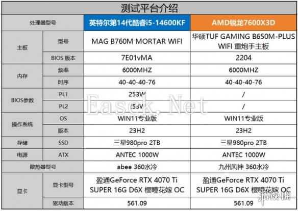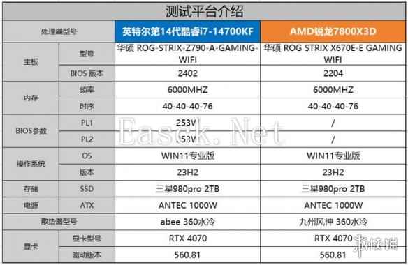 首先我们先来看一下英特尔第14代酷睿i7-14700KF和AMD锐龙7800X3D的对位结果,首先两款处理器的参数规格和本次所使用的测试平台。由于这次的测试结果是本周完成,而7600X3D是近期发布,测试时间较为紧张,所以测试项目略有不同,以本次的实际展示的结果为准。