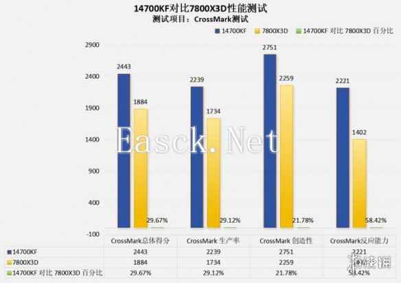 CrossMark是一款测试整机综合性能的软件,反应整机处理器在多场景下的实际性能表现,在这个测试中,英特尔酷睿i7-14700KF的总分领先7800X3D达到29.67%,而反应能力得分更是领先幅度达到58.42%,在日常使用过程中的实际生产力方面的表现,i7-14700KF还是有着明显的领先的。