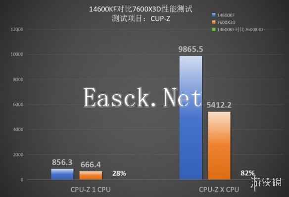 CPU-Z的测试中,单核性能上和多核心性能上,14600KF分别领先7600X3D为28和82%,同样有着巨幅的领先。