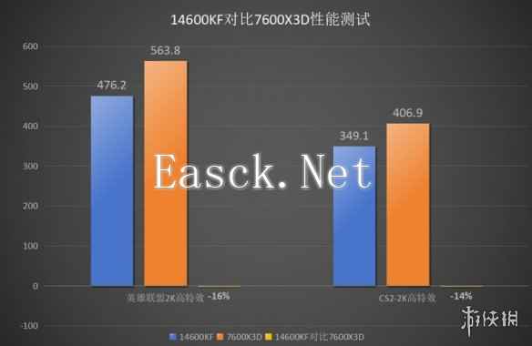 网络游戏上,我们选择2K分辨率高特效进行测试,可以看到,英特尔酷睿i5-14600KF的LOL和CS2游戏成绩落后AMD锐龙7600X3D分别为16%和14%。