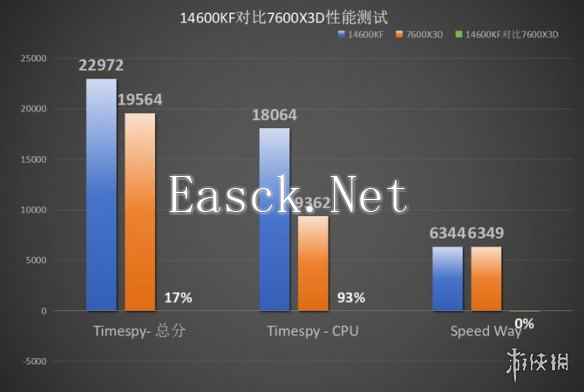 ARK测试项目中,TimeSpy的总分上,14600KF领先7600X3D为17%,而CPU得分上更是领先93%,同样近乎翻倍的性能领先,Speed Way两款基本没有任何差别,因为这个测试主要考量的显卡的性能表现,两款处理器基本都没有拖累4070Super的显卡性能发挥。