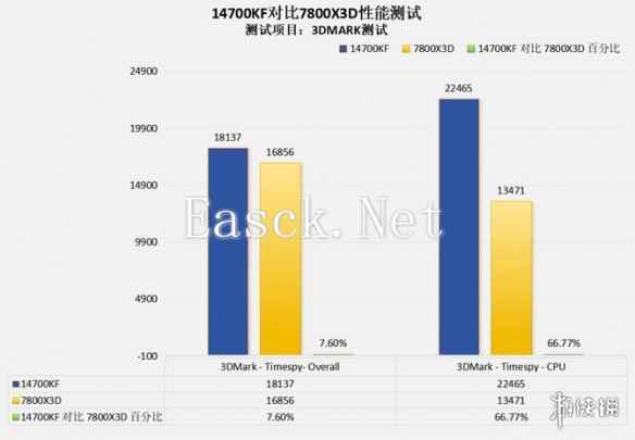 另一项ARK的测试中,TimeSpy主要考量的2K分辨率,DX12游戏基准性能,也是我们日常常用的游戏跑分,在这个项目的测试上,英特尔酷睿i7-14700KF的CPU物理得分高达22465,领先AMD锐龙7800X3D高达66.7%,性能领先程度非常巨大。