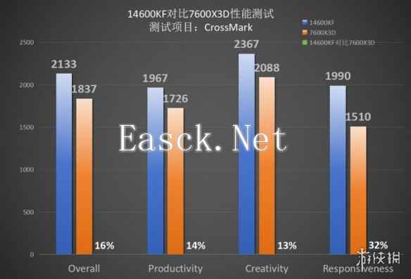 CrossMark是一款测试整机综合性能的软件,在各个项目里面可以看到,i5-14600KF的总分领先7600X3D为16%,其余三个子项的测试分别领先14%、13%和32%,综合性能领先幅度非常大。