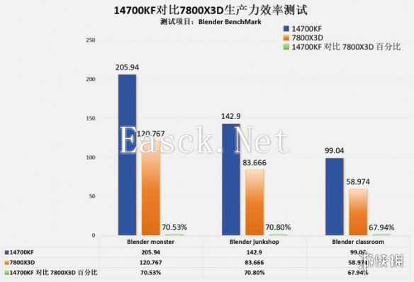 对于生产力这种应用来讲,高主频、多核心的i7-14700KF的优势立马就显示了出来,Blender渲染测试中,我们可以看到三个子项目的渲染上,英特尔酷睿i7-14700KF领先接近70%,这样的性能表现,非常出色,对于需要后期内容创作、渲染的用户来讲,在生产力方面,明显的是英特尔酷睿i7-14700KF性能优势更大。
