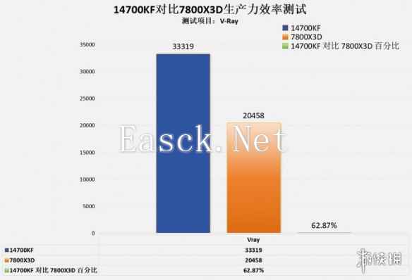 V-Ray是一款小巧的渲染工具,是非常多用户常用的后期渲染工具,我们使用Benchmark对两套处理器进行测试,得到上面的结果,14700KF的得分为33319,7800X3D的成绩为20458,14700KF的领先幅度达到62.87%,性能领先非常巨大。