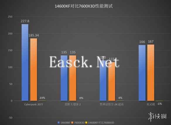 3A游戏测试上,可以看到赛博朋克2077游戏上,14600KF领先7600X3D约23%,荒野大镖客2成绩打平,黑神话悟空2K分辨率超高画质推荐预设,成绩则是领先4%,刺客信条英灵殿则是落后1%,基本算持平。