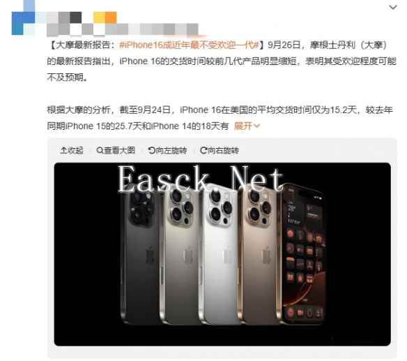 截至报告发布时,iPhone 16在美国的平均交货时间仅为15.2天,远低于去年iPhone 15的25.7天和iPhone 14的18天。而在国际市场上,iPhone 16的平均交货时间也下降至16.3天,低于iPhone 15的28.5天。这些数据均表明,iPhone 16的市场需求并未如预期般强劲。
