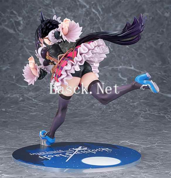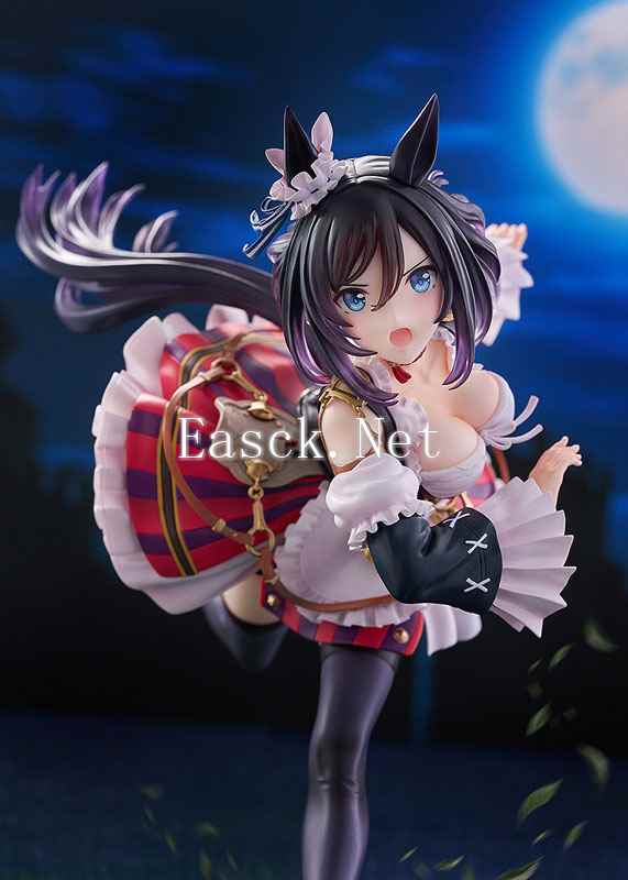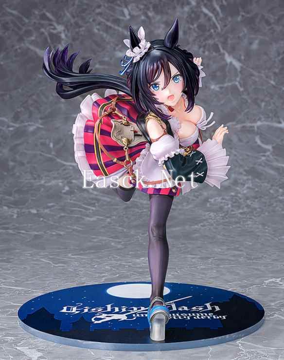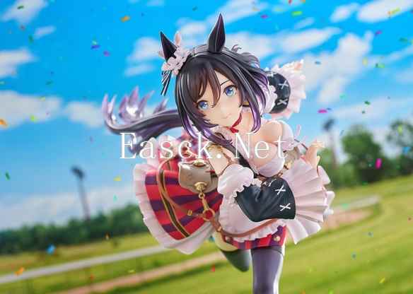 手办采用了游戏中荣进闪耀的决胜服造型进行立体化。来自德国,一丝不苟的留学生马娘荣进闪耀一头黑发扎着利落的马尾。可爱的马耳上点缀着花朵装饰,奔跑中的少女脸上展露着坚毅的表情。华丽的胜负服采用了女仆装风格,束腰之上,傲人的胸部随着倾身奔跑的姿态尽情展现在玩家面前。袖口的宽大折边十分华丽,荷叶边的裙摆之下,黑色的运动短裤与包裹双腿的黑色长袜同样值得一看。手办附带有“微笑脸”表情替换件,展现出荣进闪耀一脸轻松的样子。