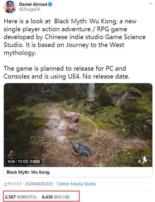 国外著名分析师Daniel Ahmad也在推特上发布了《黑神话:悟空》的实机演示,收获了2567的转推和评论,以及6438个赞。评论中不少玩家国外玩家对《黑神话:悟空》的出现也异常兴奋。