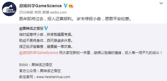 微博原文: “临时起意哼小曲,拼凑剪辑莫考据。 取经不易炼身体,西天路遥多休息。 指正批评皆善意,健康第一常欢喜。 @游戏科学GameScience 祝大家在新的一年里,继续以饱满的情绪,投入每一场平凡的战斗!” 从视频中可以看到悟空充满斗志,使出各种招式,大战妖魔鬼怪和Boss。官方表示这段视频是专门为牛年春节录制的,与游戏实际剧情无关。 视频截图: