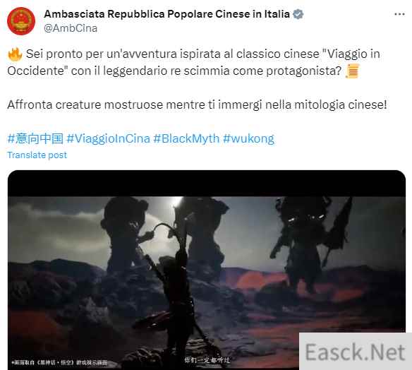 大使馆表示:“"您准备好开始一场以中国经典名著《西游记》为灵感,以传奇美猴王为主角的冒险了吗?沉浸在中国神话中,面对各种可怕的怪物!” 值得一提的是,据《黑神话:悟空》Steam商店页面显示,本作目前支持中文、英语等11种语言,暂不支持意大利语。