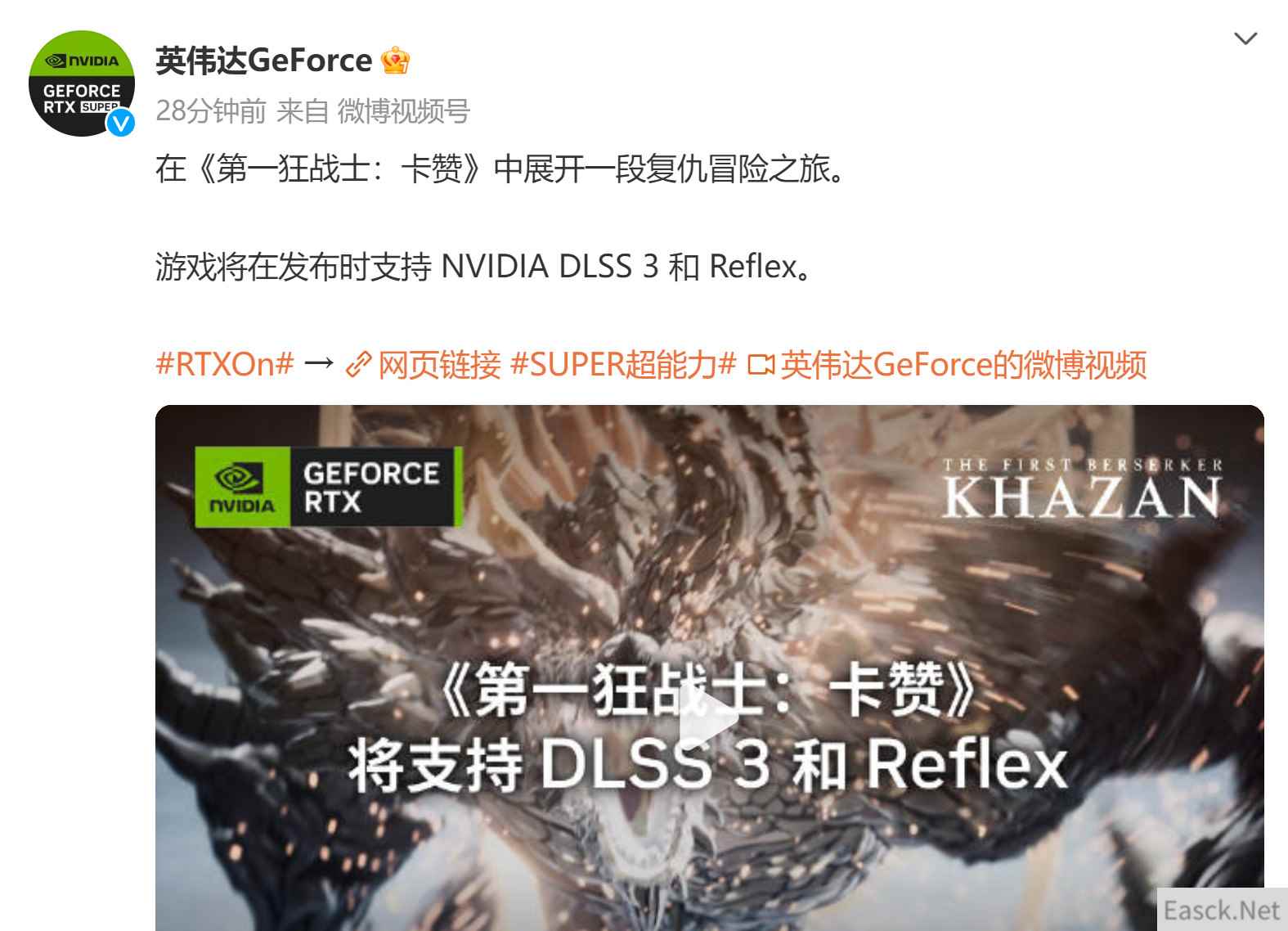 英伟达官方微博: 《第一狂战士:卡赞》 在《第一狂战士:卡赞》中展开一段复仇冒险之旅。游戏将在发布时支持 NVIDIA DLSS 3 和 Reflex。