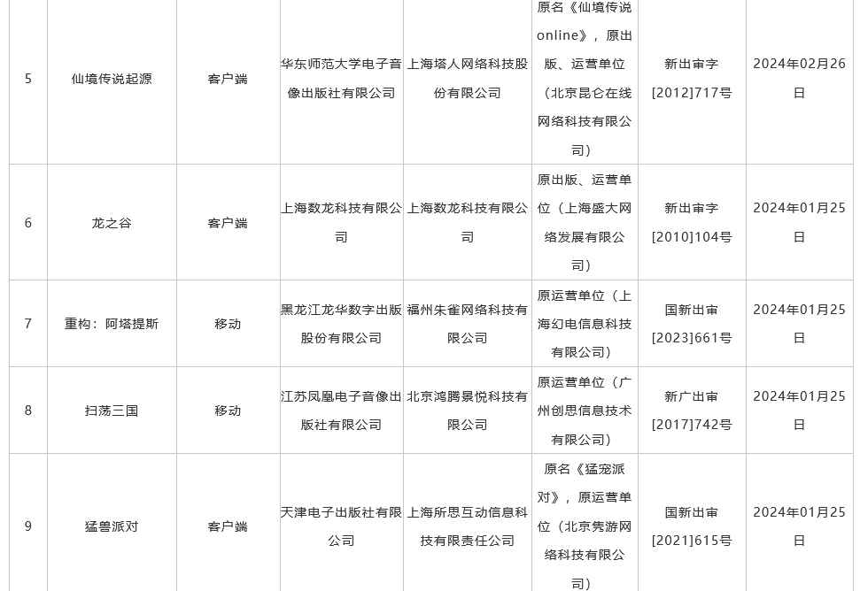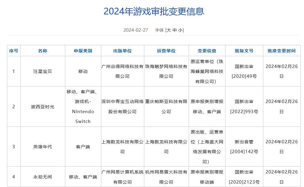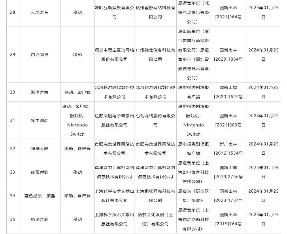 共35款游戏申报类型、运营单位、游戏名称等有所变更,其中包括《波西亚时光》(新增移动端、客户端)、《女神异闻录:夜幕魅影》(新增客户端)、《笼中窥梦》(新增NS)等。