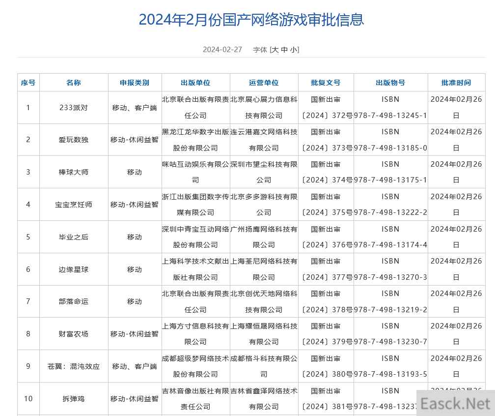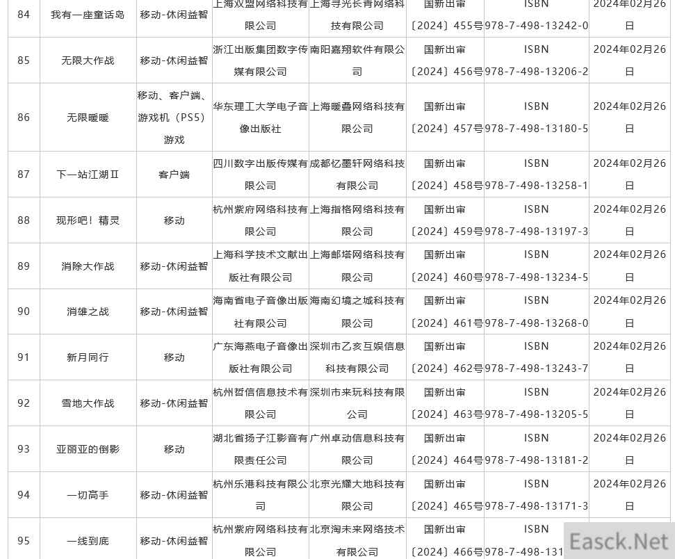今日(2月27日),国家新闻出版总署公布《2024年2月份国产网络游戏审批信息》以及《2024年游戏审批变更信息》,值得注意的是,过审作品包括今年8月20日发售的《黑神话:悟空》,此外,竞技游戏《永劫无间》申报类型新增移动端,《永劫无间》手游将上线。共111款国产游戏过审,其他包括《苍翼:混沌效应》、《尼罗河勇士2》、《无限暖暖》等游戏过审。