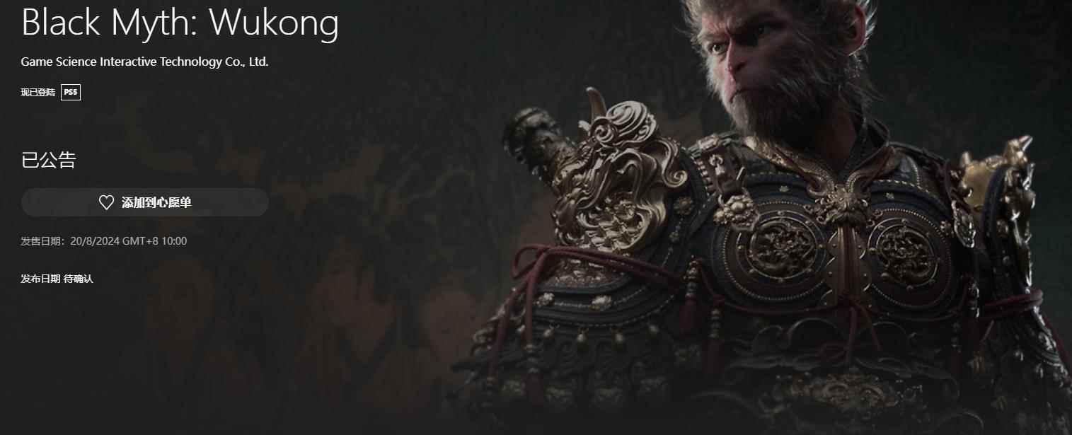 《黑神话:悟空》PS5商店页可添加心愿单 8月20日上午10点发售