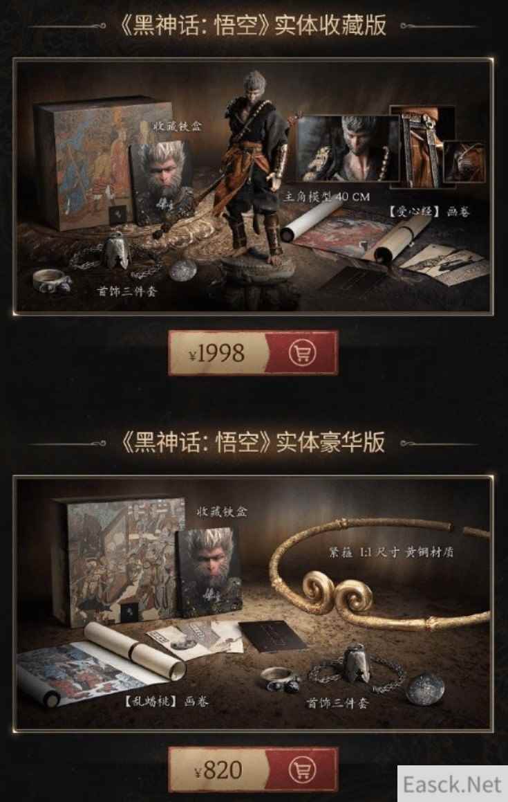其中实体豪华版售价820元,包含收藏铁盒和WeGame豪华版游戏激活码、紧箍(1:1尺寸黄铜材质)、风铎项链&雷榍指环&金乌徽章三件套、乱蟠桃画卷和明信片等。实体收藏版售价1998元,该版本在上述内容基础上,将紧箍替换为了主角1:6可动人偶“直面天命”(40cm),将“乱蟠桃”画卷替换为“受心经”画卷。 近日《黑神话:悟空》主美杨奇在微博上晒出自己头戴实体豪华版金箍的照片,并表示:“我头大,你瞧都卡住了..”