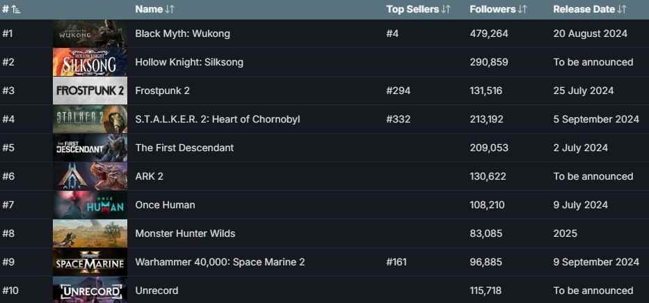 《黑神话:悟空》自公布后便备受国内外玩家关注,目前该作在Steam愿望单收藏榜上处于榜首位置。而《空洞骑士:丝之歌》《冰汽时代2》《潜行者2》分别位居第二、第三和第四。