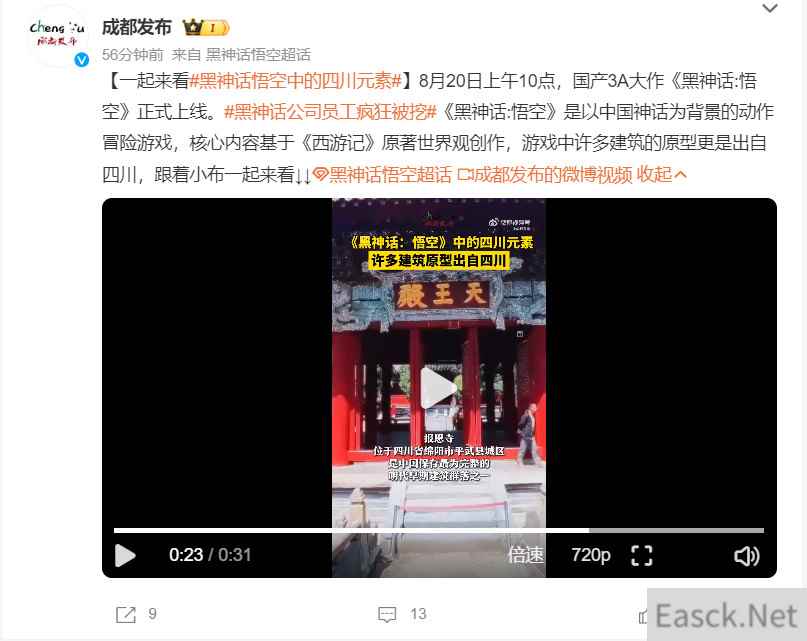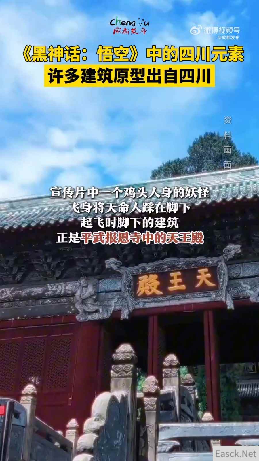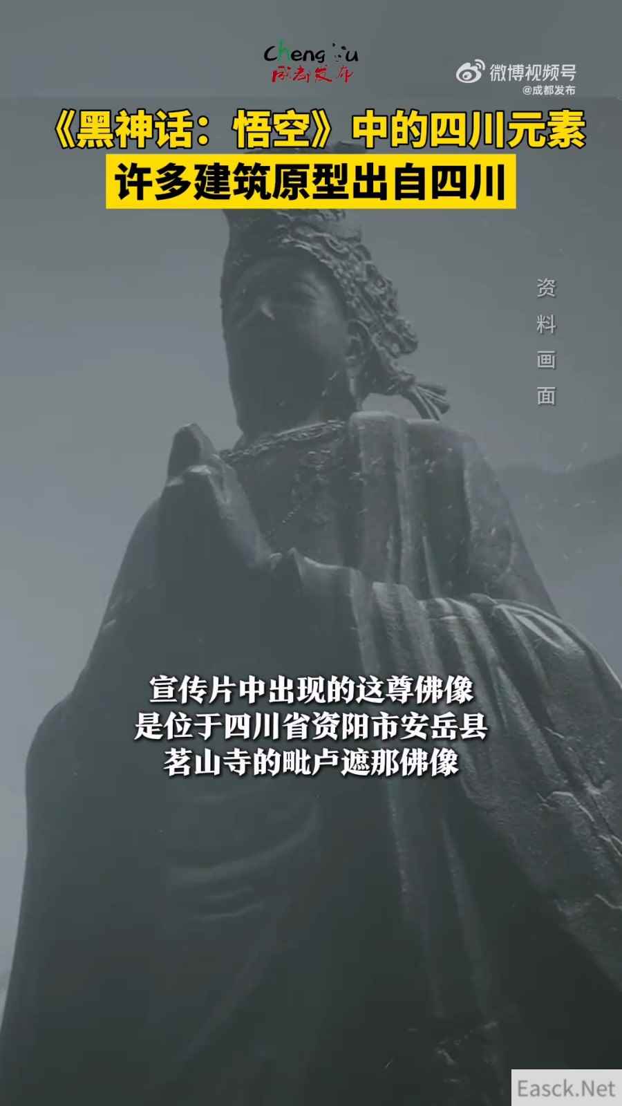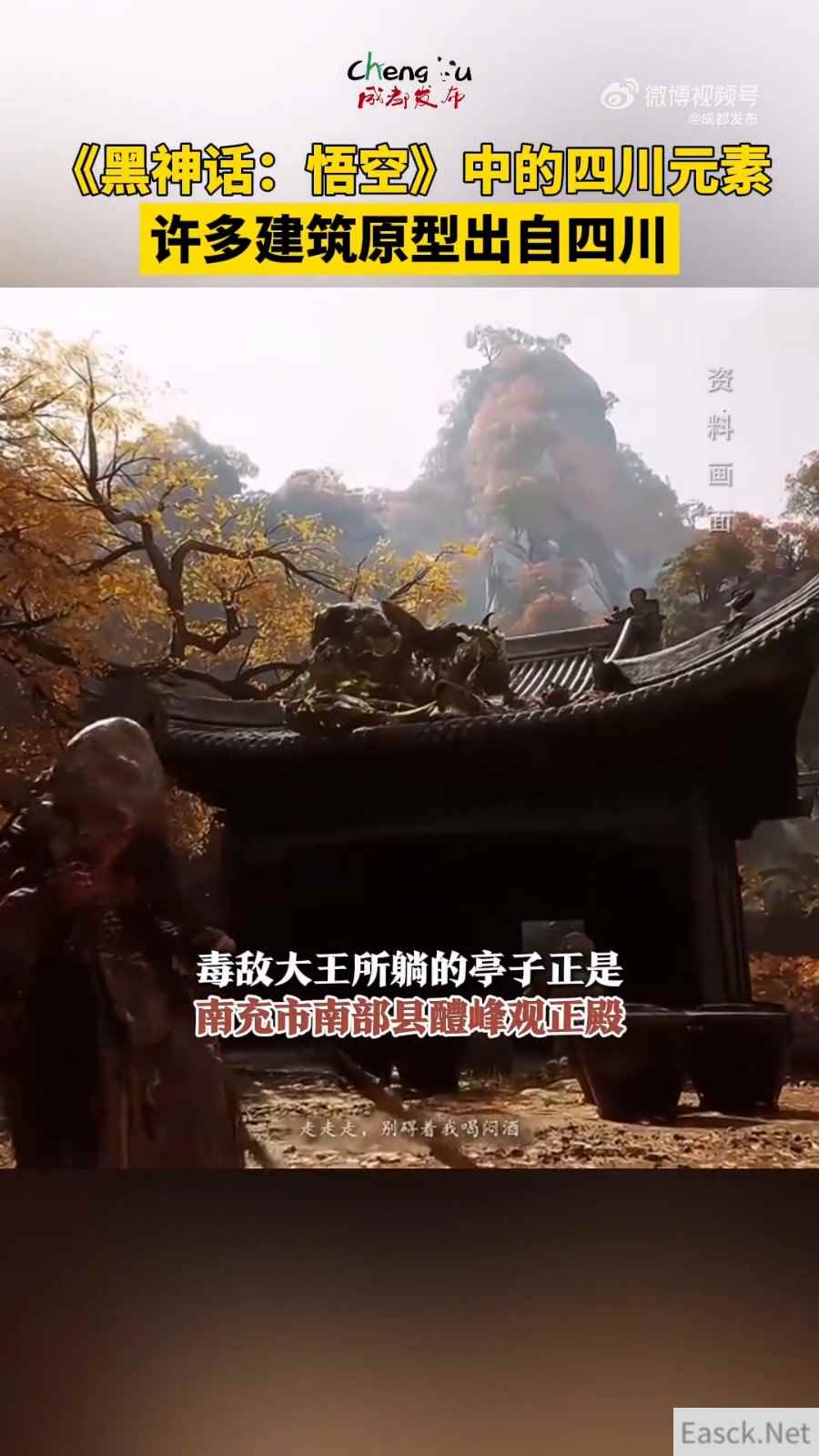另外,成都发布透露《黑神话:悟空》游戏中许多建筑的原型更是出自四川,毒敌大王所在的亭子正是来自于南充市南部县醴峰观,宣传片中出现的汉阙背景来自于绵阳市平阳府汉阙,此外还有平恩报恩寺天王殿,资阳市安岳县茗山寺毗卢遮那佛像。