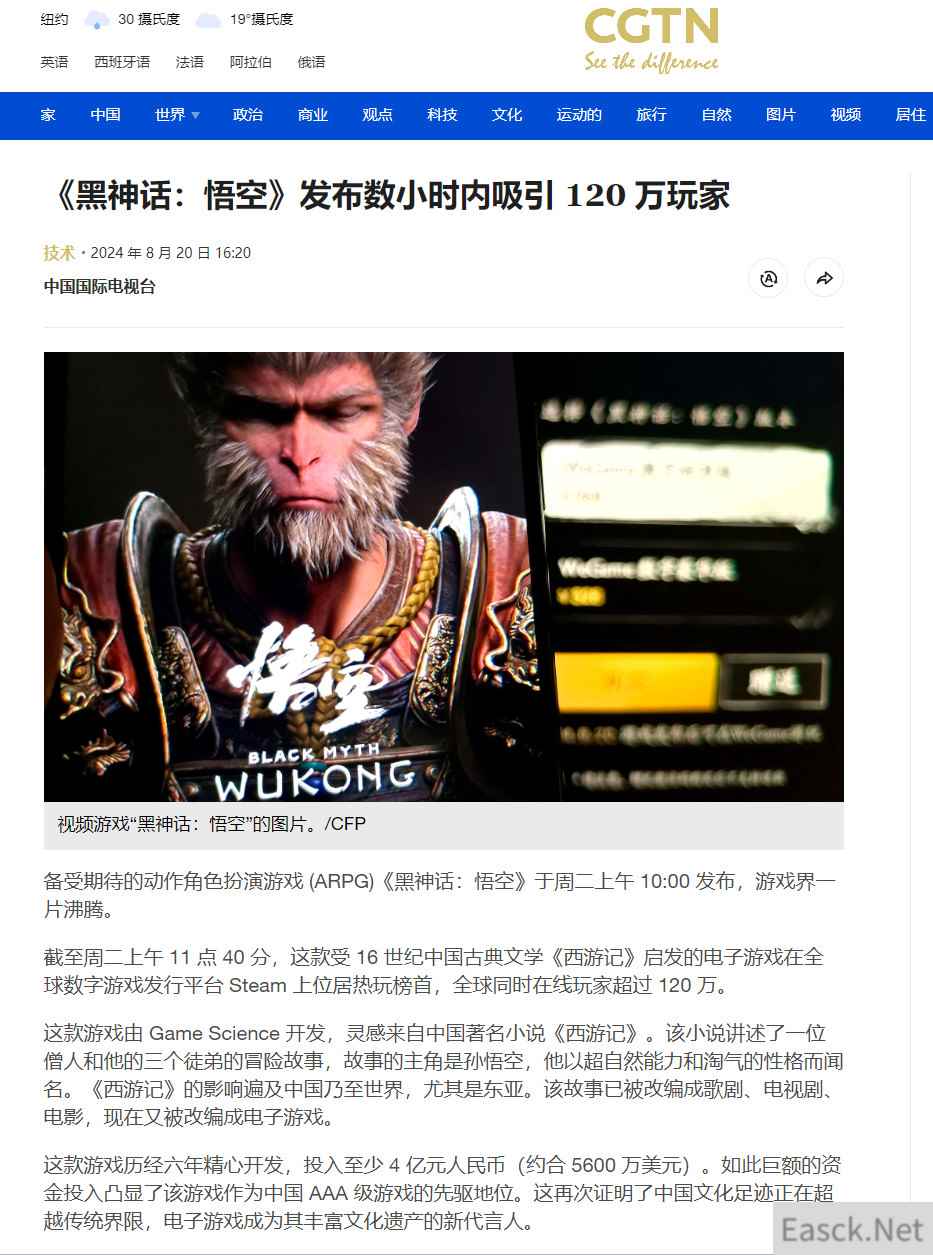 彭博社报道截图 央媒CGTN(中国国际电视台)在报道时指出,《西游记》的影响遍及中国乃至世界,尤其是东亚。该故事已被改编成歌剧、电视剧、电影,现在又被改编成电子游戏。 这款游戏历经六年精心开发,投入至少4亿元人民币(约合5600万美元)。如此巨额的资金投入凸显了该游戏作为中国AAA级游戏的先驱地位。这再次证明了中国文化足迹正在超越传统界限,电子游戏成为其丰富文化遗产的新代言人。 这款游戏的预售表现十分亮眼,在全球多个地区夺得Steam畅销榜冠军。业内专家预测该游戏的销量将达到天文数字,保守估计为500万份,而雄心勃勃的估计为1000万份。除去平台佣金,该游戏的营收可能超过26亿元人民币。这一数字凸显了该游戏成为巨无霸的潜力。
