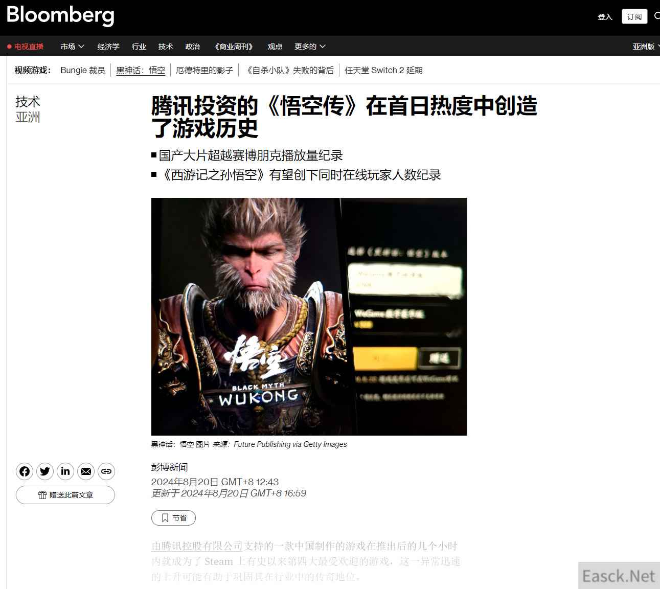 外媒报道《黑神话》首发成功:腾讯投资、创造了游戏历史