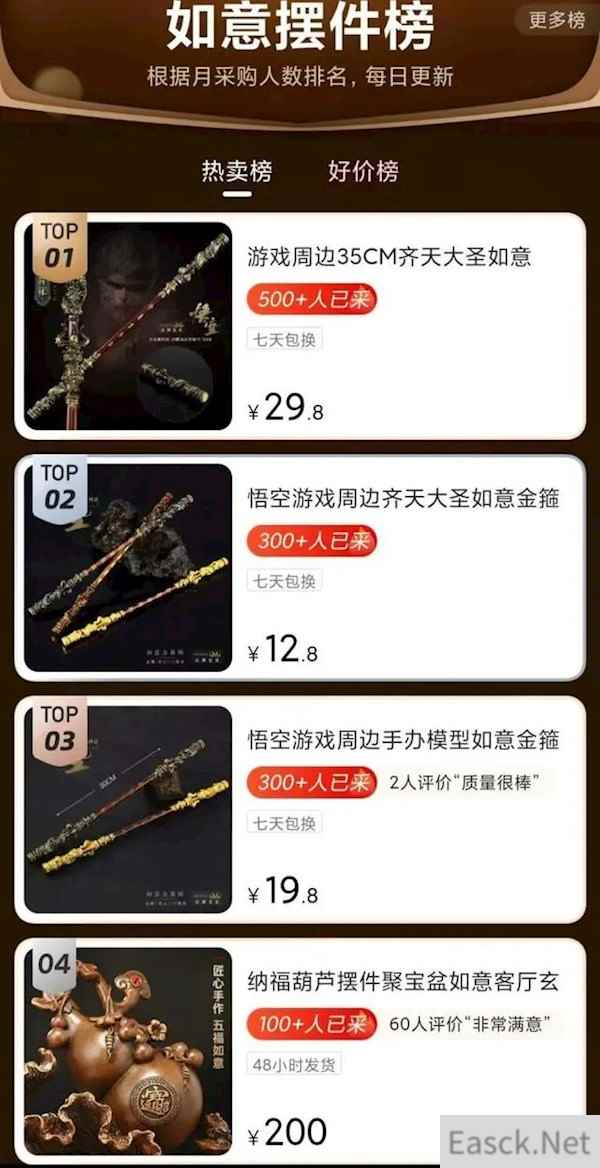 最近,因为《黑神话:悟空》大火,而且与众多品牌都有联名,很多参观的朋友和网友就想到了联名,其实并不是。 值得注意的是,随着游戏火爆,金箍棒、孙悟空等周边产品确实也火了起来,电商平台显示一款印有游戏主人公的金箍棒这个月已经销量近5000。 商品页面显示,一周内有超过100人购买。而在1688批发平台上,金箍棒已位列如意摆件榜榜首,最高顾客回头率达76%。