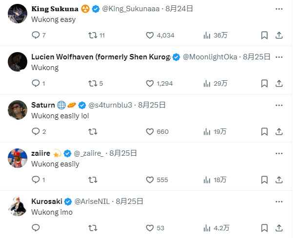 这个推文在X上吸引了2219.4万查看,超过3000条评论。国外网友的回答也非常不一。对《西游记》有一定了解的玩家几乎清一色支持悟空,但很多网友从《战神》游戏的逻辑出发推理,认为是屠神专业户奎爷必胜。 玩家@HailLordMidas回复说:“孙悟空根本死不掉,他把自己的名字从生死簿上抹去,只被佛祖打败过。他打起来就像1000个天神一样同时战斗,他一个筋斗云能翻十万八千里。我喜欢奎托斯,但不要让我的男孩失败。”