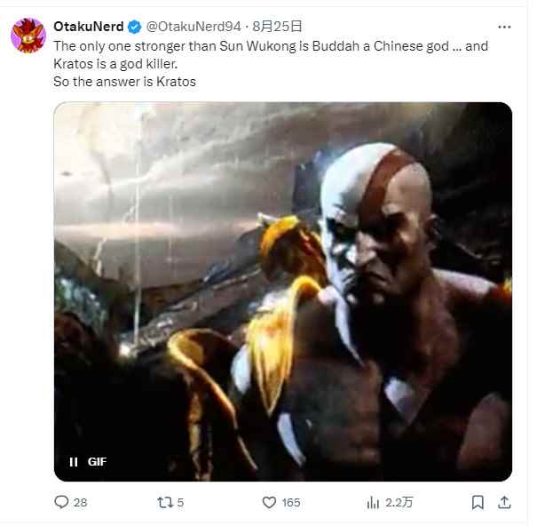 玩家@OtakuNerd表示:“唯一比悟空更强的是佛祖,他是中国人的神,而奎爷是弑神者,所以答案是奎爷。”