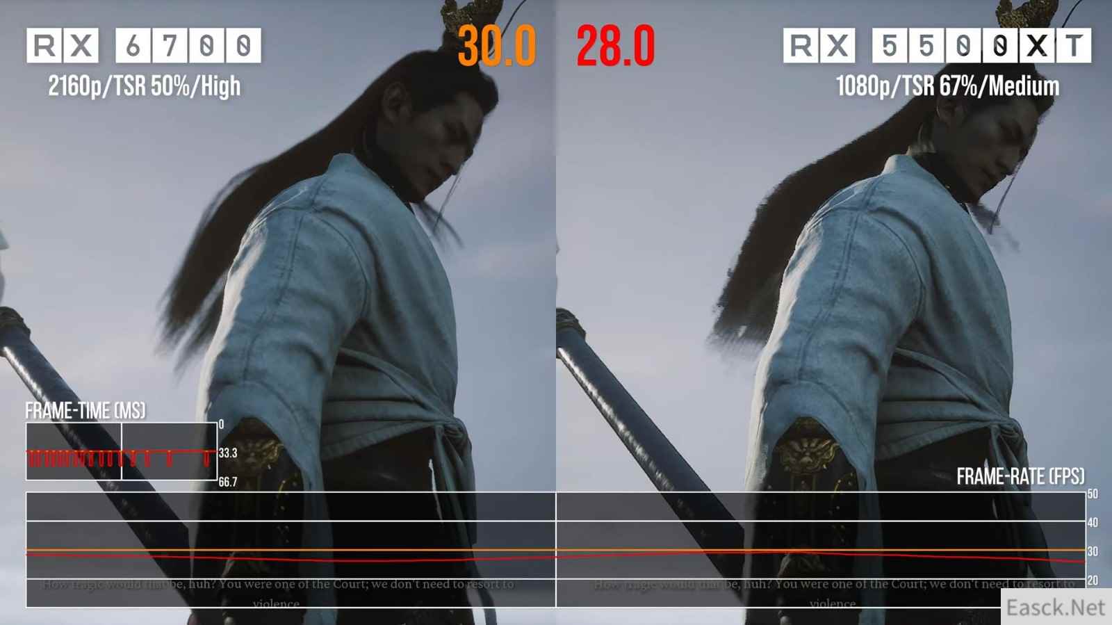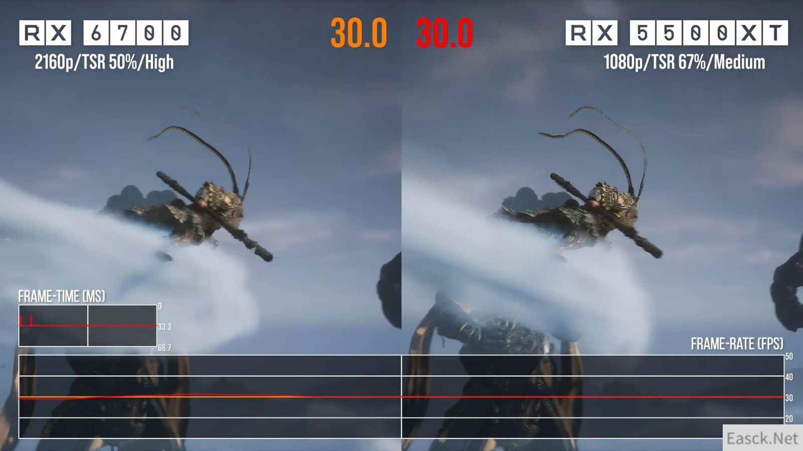 首先,数毛社认为游戏科学在开发《黑神话:悟空》的主机版时遇到了一些问题,即使是现在已经发售的PS5版,其性能表现也不太令人满意,质量模式无法稳定30帧/秒,平衡模式限制为45帧/秒,虽然性能模式使用FSR 3 帧生成可以提供60帧/秒的游戏体验,但代价是输入延迟和拖影问题。 随后,数毛社使用了一台搭载了RX 6700显卡的PC主机,在匹配的设置下运行了PC版的《黑神话:悟空》,RX 6700显卡与PS5和Xbox Series X使用的图形处理器性能类似。结果有趣的是,该PC版游戏的运行速度慢了约6%,而通常RX 6700的运行速度比PS5快5%左右。 数毛社认为游戏科学不想过多地削减PS5版的视觉效果,该版本基本是在高设置下运行的。在这在心态下,数毛社将RX 6700换成了RX 5500 XT,后者与Xbox Series S使用的图形处理器性能类似,但即使是在1080p分辨率下(从720p升级),游戏也会出现问题。《黑神话:悟空》的视觉效果和植被密度可以挑战PS5,而在与Xbox Series S相当的硬件上,即使是稳定30帧/秒也很难实现。