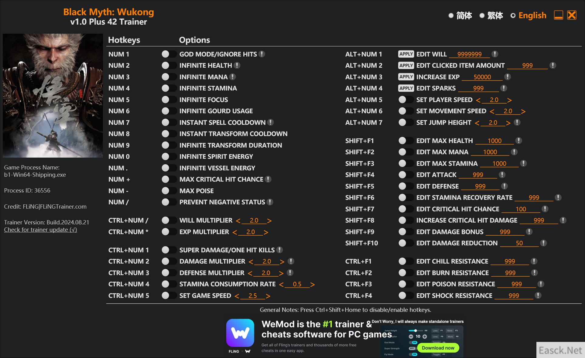 《黑神话:悟空》风灵月影修改器最新版本是v1.0+,最近更新于8月21日,可提供无限血量,无限魔法。