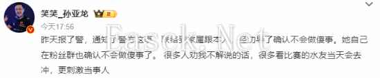 此外,孙亚龙今日下午还在微博发文确认潘慧“不会做傻事”。 原文:昨天报了警,通知了警方这事,联络到家属跟本人,经劝导了确认不会做傻事。她自己在粉丝群也确认不会做傻事了。 很多人劝我不解说的话,很多看比赛的水友当天会去冲,更刺激当事人。那就三号见!尊重生命!正能量看S赛!