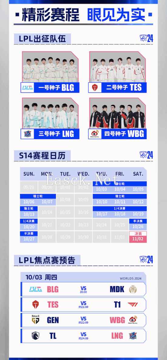10月3日(今晚)20:00起,2024英雄联盟全球总决赛(S14)瑞士轮将正式拉开序幕,BLG、TES、LNG、WBG四支队伍代表LPL出征S14。